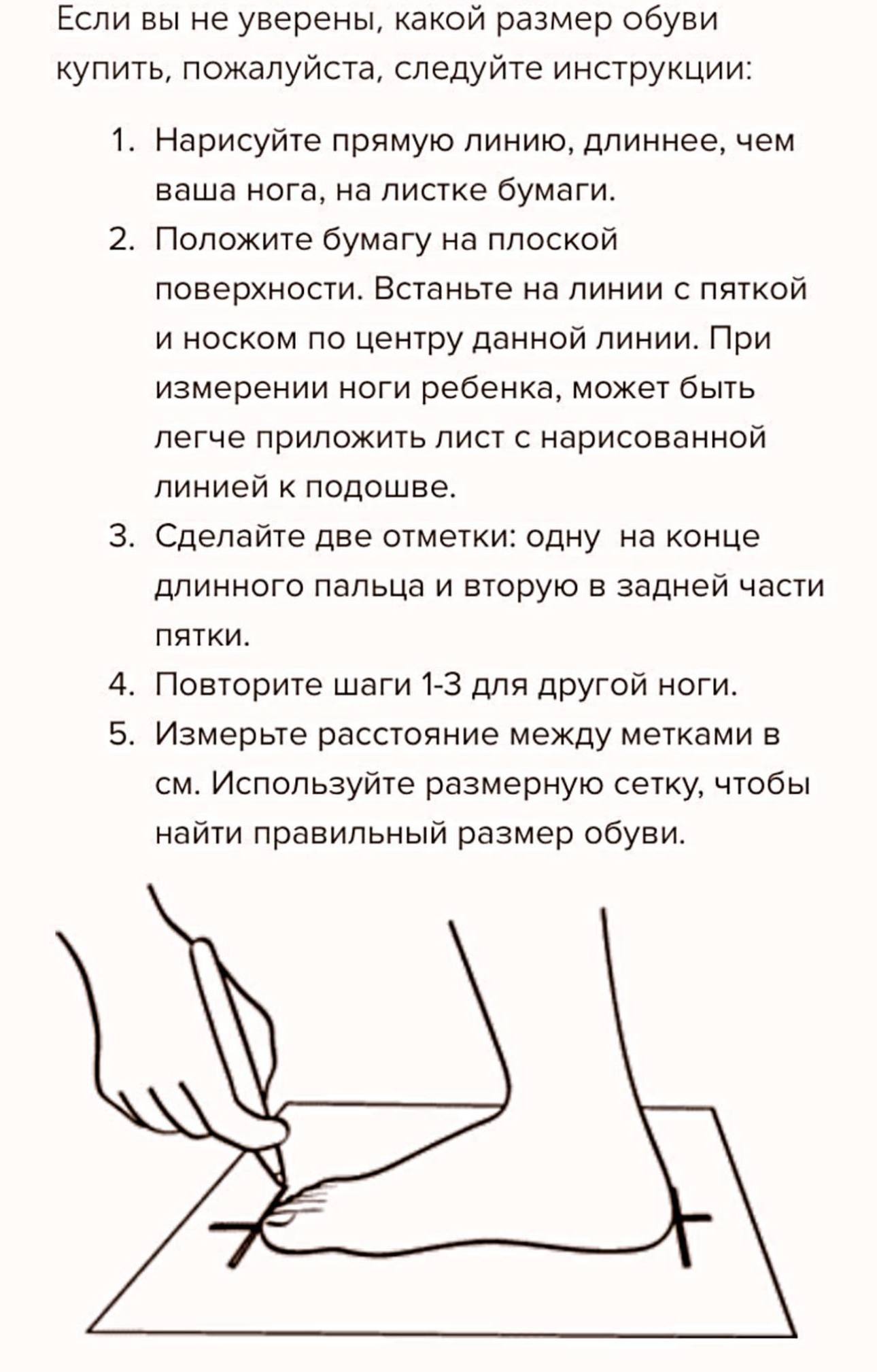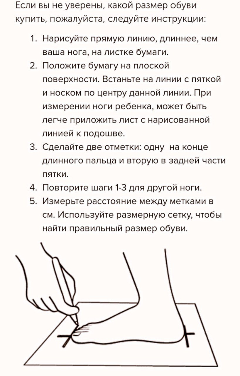 Повторите измерение для второй ноги, затем сверьте оба результата с нашей таблицей размеров, чтобы выбрать подходящий размер.